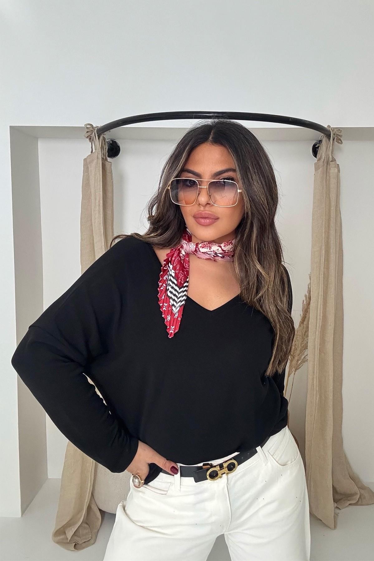 Ön Arka V Yaka Yumoş Örme Bluz Siyah