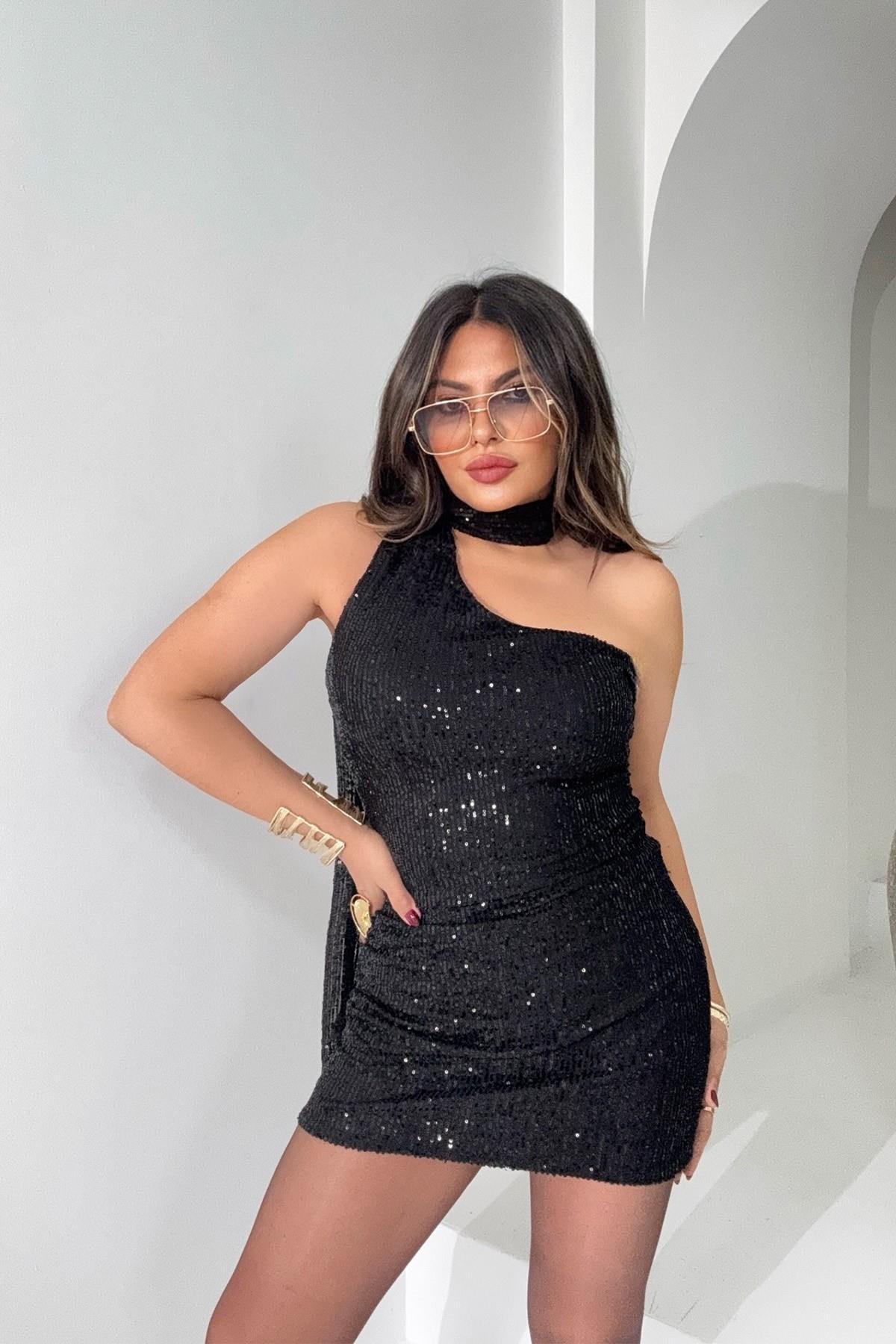 Payetli Tek Omuz Fularlı Elbise Siyah