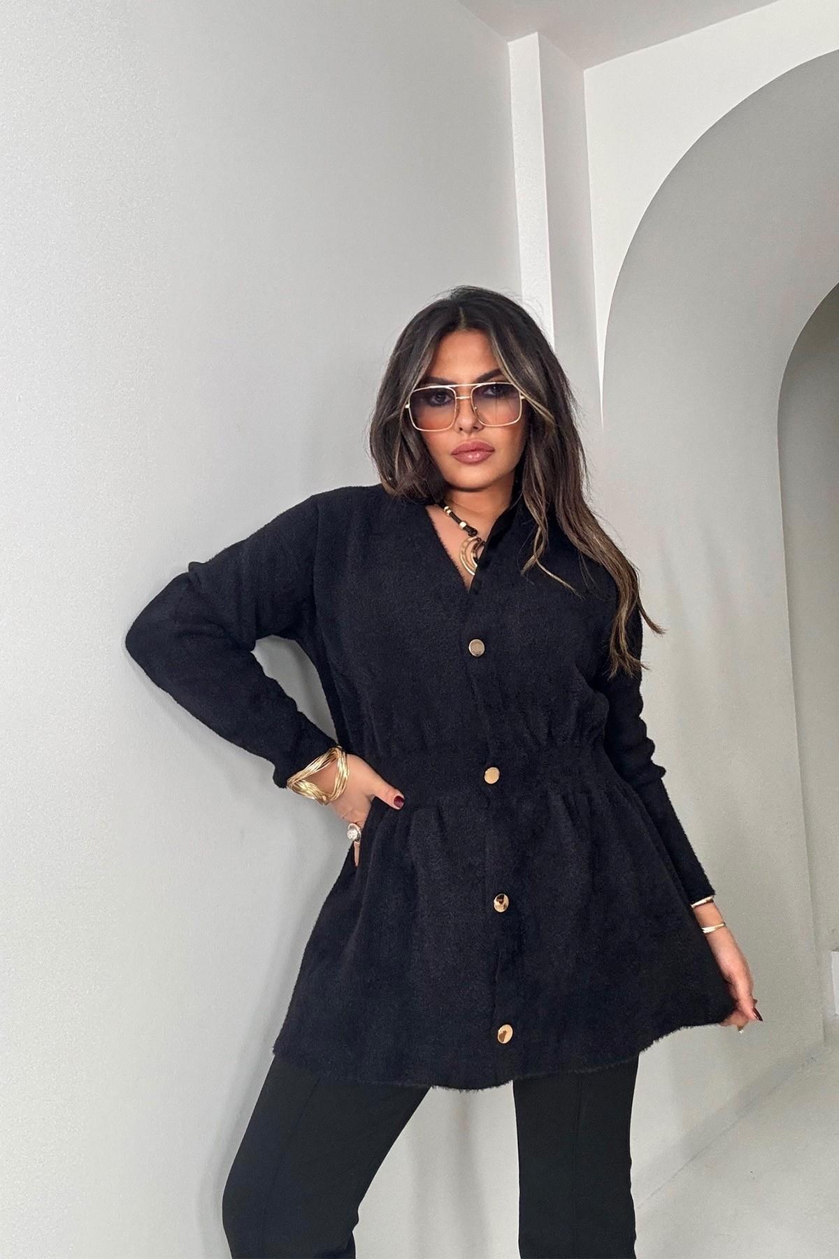 Sakallı Örme Beli Lastikli Hırka Siyah