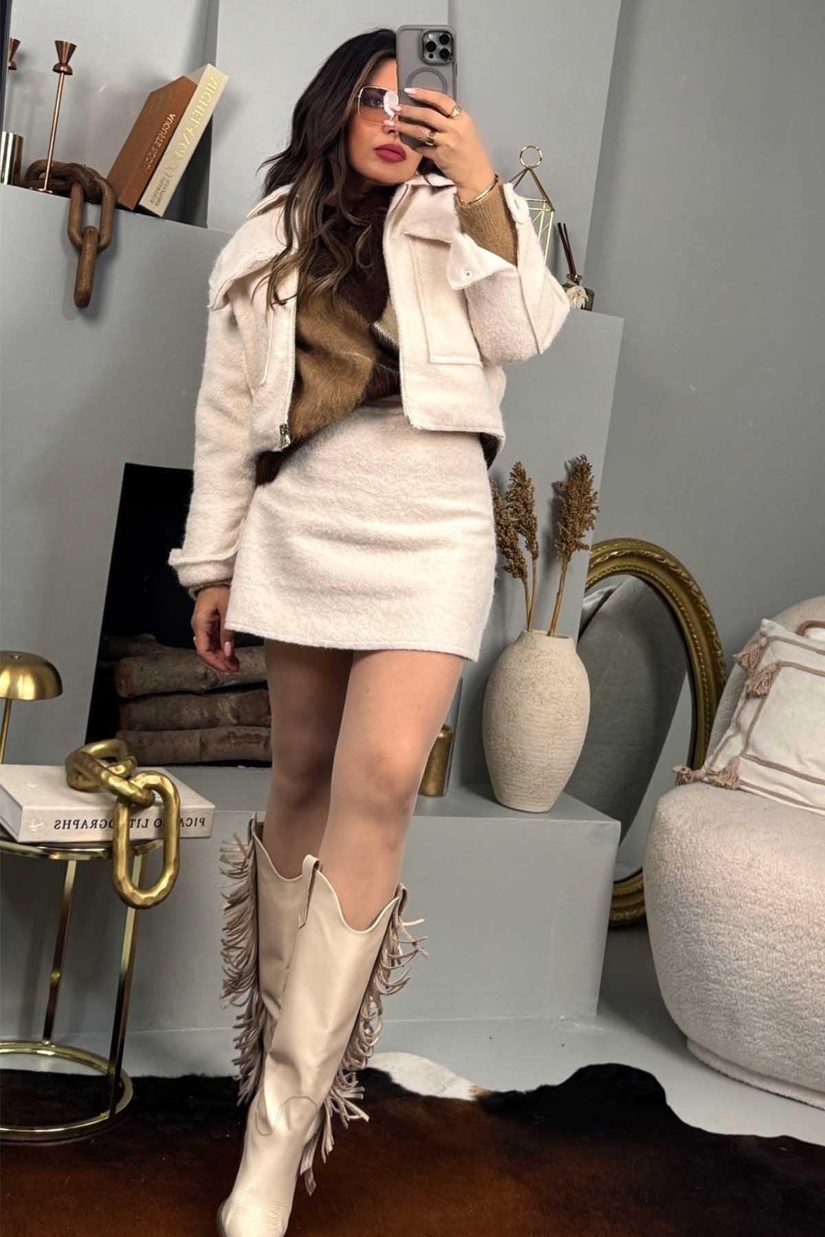 Tüylü Kaşe Ceket Etek Takım Taş